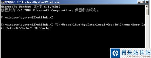 第五步:在彈出的命令行窗口輸入 : mklink /D "C:/Users/登錄用戶名/AppData/Local/Google/Chrome/User Data/Default/Cache" "R:/Cache"