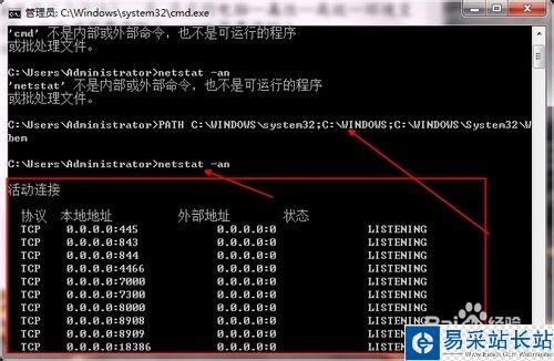 4、再輸入netstat -an進行檢測一下是否導入了路徑,出現圖片中所示字樣說明導入成功,但是這樣只能用這一次,需要永久使用的話必須到我的電腦—屬性—高級—環境變量 里面重新設置路徑,按新建變量名輸入:path變量值輸入:%SystemRoot%/system32;%SystemRoot%;%SystemRoot%/System32/Wbem