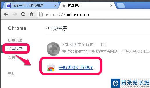 2、進入設置頁面后,我們切換到擴展程序,然后點擊獲取更多擴展程序的連接