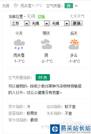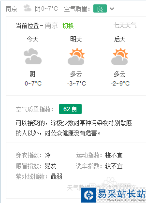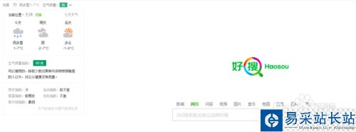 2、將鼠標移至360好搜界面左上角城市天氣區域,該區域將顯示該城市天氣的詳細情況,如圖所示: