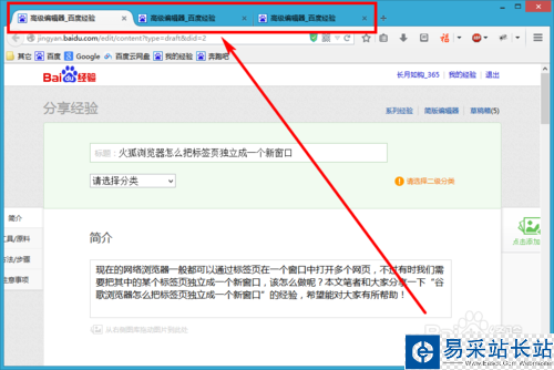 3、打開多個標簽頁,我已經打開了3個“百度經驗編輯器”的標簽頁,如下圖所示: