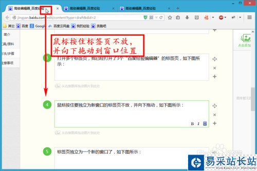 4、鼠標按住要獨立為新窗口的標簽頁不放,并向下拖動,如下圖所示: