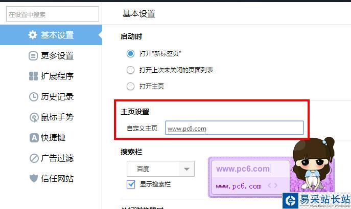 2、然后點(diǎn)擊“基本設(shè)置”==主頁設(shè)置中==輸入你要設(shè)置的網(wǎng)址