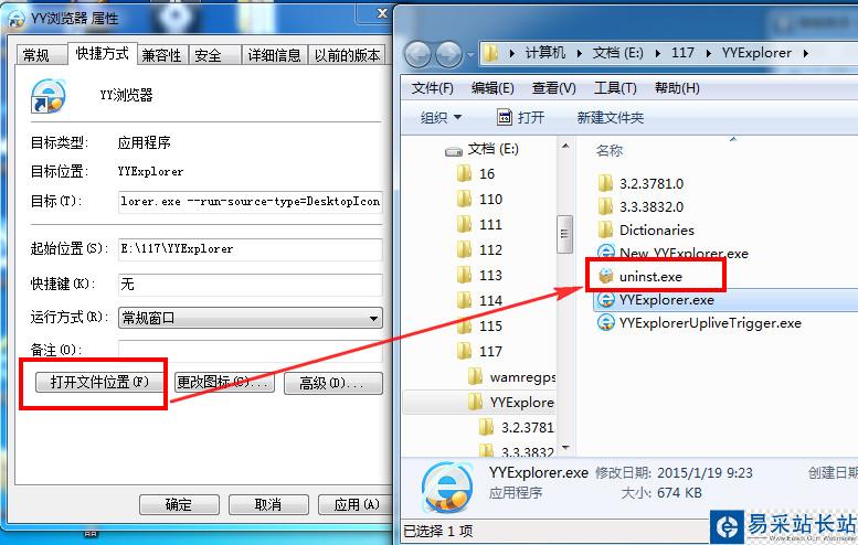 方法三:我們右擊yy瀏覽器圖標==“屬性”==“打開文件位置”==點擊“uninst.exe”