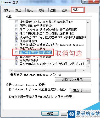 2、選擇【高級】選項(xiàng)卡,去掉【顯示每個腳本錯誤的通知】的勾選。