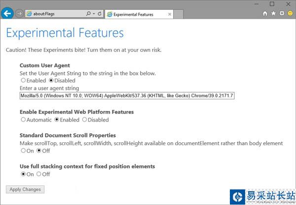 Windows 10 9926預覽版雖然沒有提供全新的瀏覽器Spartan,但是隱藏了一個體驗功能,IE11可以嘗試開啟新的渲染引擎。Spartan將是從里到外都不同于IE的真正全新瀏覽器,界面變化倒在其次,關鍵的是從渲染引擎到網頁技術都是重新打造的,號稱更適合現代的HTML網站,也提高了交互性。