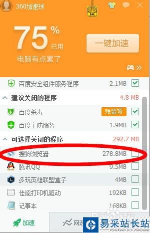 利用“360加速球”來清理搜狗瀏覽器所生成的緩存文件,此方法將同時關閉搜狗瀏覽器。