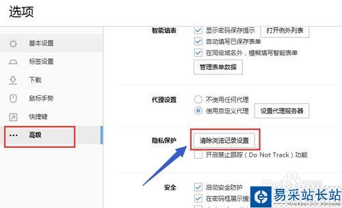 2、在打開的“選項”界面中,切換到“高級”選項卡,點擊“隱私”欄目中的“清除瀏覽器記錄設置”按鈕。