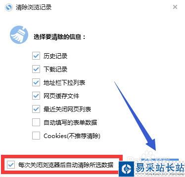 3、在彈出的窗口中,勾選要清除的項目,同時勾選“每次關閉瀏覽器后自動清除所有數據”項,點擊“清除數據”按鈕。