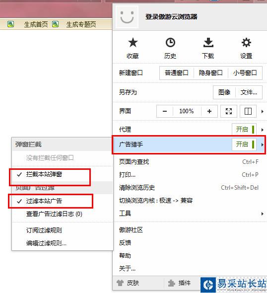 2、在下拉菜單中,開啟廣告獵手。記得勾選“攔截本站彈窗”“過濾本站廣告”