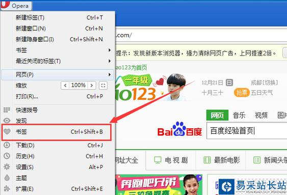 5、其實這個時候,我們已經將網頁收藏到剛才的文件夾中了,我們可以點擊左上角的菜單,如圖示