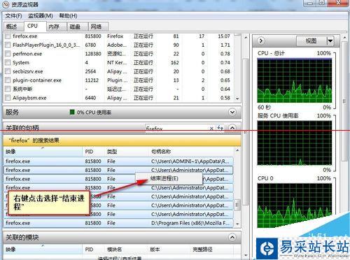 7、在下面的關聯句柄中選中關于本程序的所有進程點擊右鍵選擇“結束進程”,就會看到firefox火狐的窗口被強制性的關閉,然后重新打開瀏覽器即可。