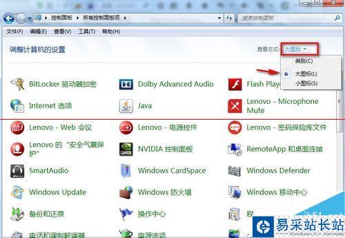 3、在“控件面板”打開的控制面板窗口中選擇查看方式為“大圖標”。
