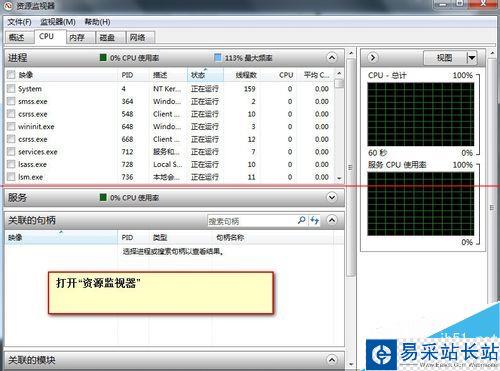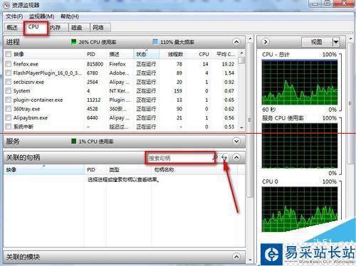 6、在“資源監視器”窗口中選中“CUP”選項卡在“搜索句柄”文本框中輸入“firefox”點擊后面的搜索按鈕。