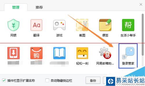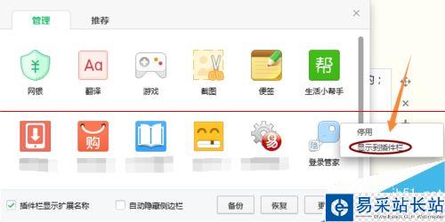 3、之后就會在彈出的窗口下看到所有我們安裝過的小插件,有一些是系統(tǒng)自帶的;我們點擊“登錄管家”,然后將其“顯示到插件欄”