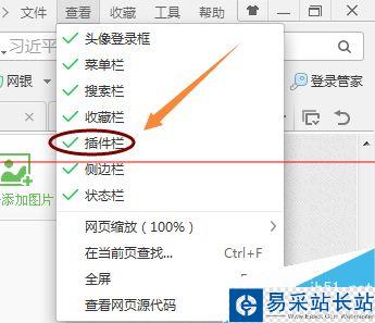 1、打開360瀏覽器以后,我們點擊右上角的“查看”,然后將查看下的“插件欄”前面打鉤選中