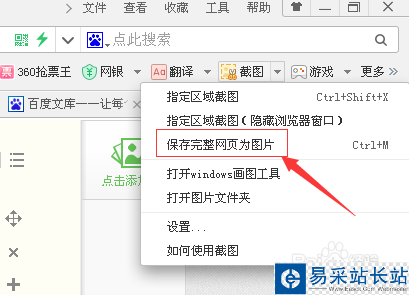 4、再選擇【保存完整網頁為圖片】選項,其中還有快捷鍵Ctrl+M組合可以進行同樣的操作,如圖