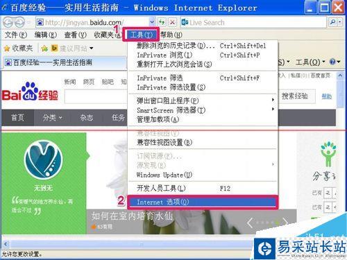2,進入IE界面后,找到菜單欄中的“工具”,打開工具菜單,然后在菜單中選擇“Internet 選項”。