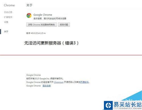 8、如果顯示“無法訪問更新服務器(錯誤4)”,錯誤 4 表示無法解決問題,建議向Chrome論壇反饋,或者直接卸載Chrome,然后直接安裝最新版。