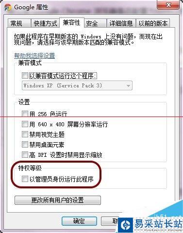 7、可以右擊Chrome快捷方式圖標,點擊“屬性”,在其中“兼容性”的“特權等級”中,確認未勾選“以管理員身份運行此程序”