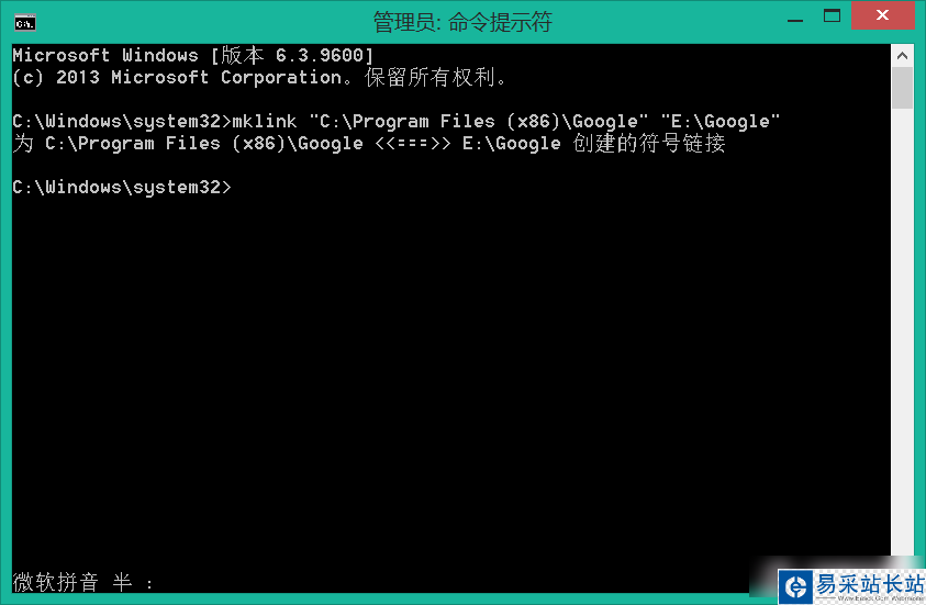 四、以管理員打開命令提示符,輸入mklink "C:/Program Files (x86)/Google" "E:/Google"(前面的引號里是默認安裝位置,后面是移動之后的位置,注意空格)。