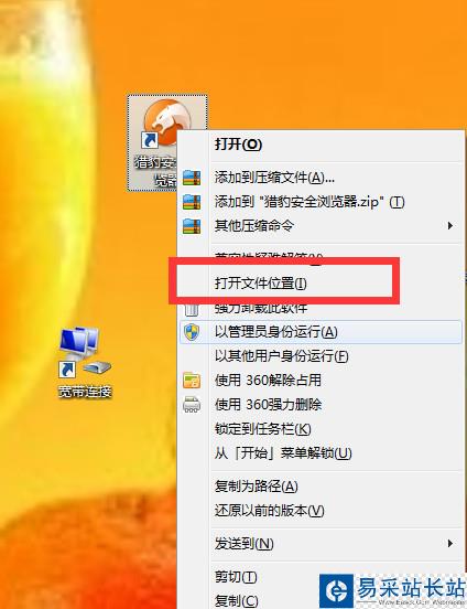 首先我們在桌面找到我們的獵豹安全瀏覽器,右鍵獵豹安全瀏覽器,選擇打開文件位置。