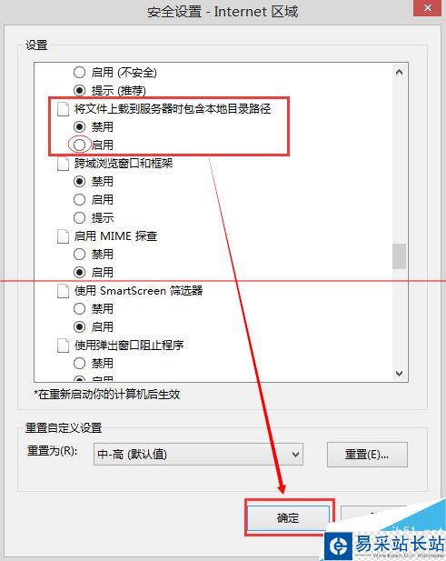 2、進入“安全”標簽,點擊“自定義級別”,然后在彈出的“安全設置”中找到“將文件上載到服務時包含本地目錄路徑”項,啟用;