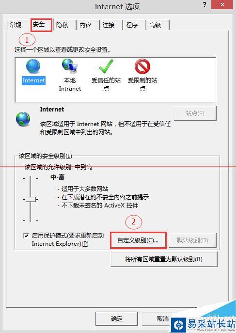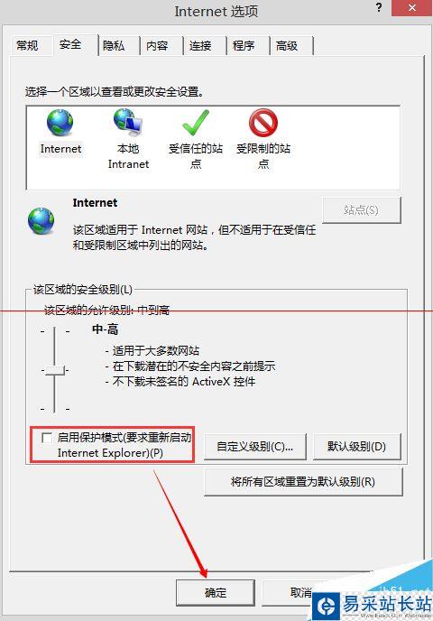 3、確定后返回“Internet選項”取消“啟用保護模式”勾選,確定退出。
