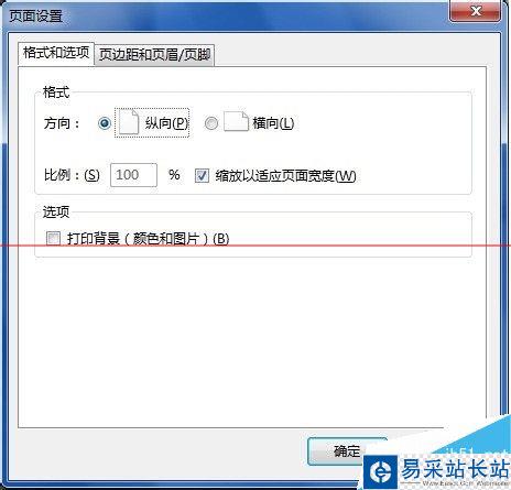 5、頁面設置對話框打開后,點擊”格式和選項“選項卡,下面包含了設置”縱向“或”橫向“打印,設置打印的比例,最下方有設置”打印背景“的復選框,將此選中,即可打印背景顏色和圖片了。
