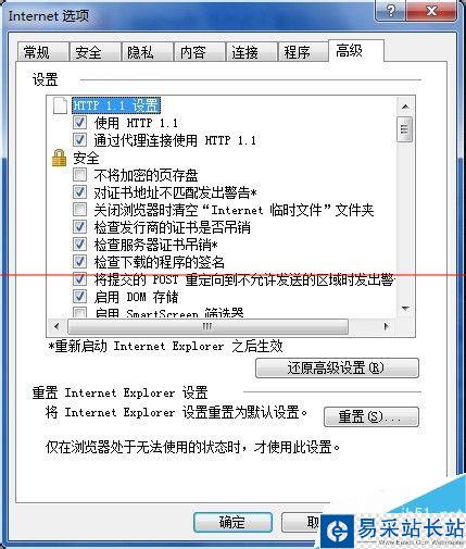 2、打開后我們有里面有七個選項卡,在這里可以對我們的瀏覽器選項進行各種各樣的設置,我們選擇最后一個“高級”選項卡。