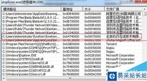 4、在彈出的窗口中,按照文件廠商排序,可以看到進程Explorer.exe中被插入了其他公司的程序。
