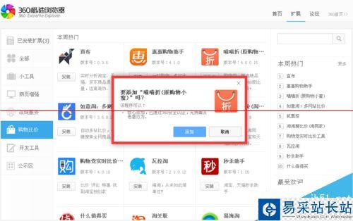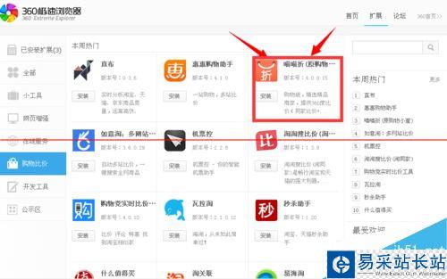 3、進入擴展中心后,看到有很多功能插件可供選擇,根據(jù)你的喜好進行選擇。我們這里主要是進行優(yōu)質(zhì)購物的,所以點取左邊界面的購物比價一項,如圖: