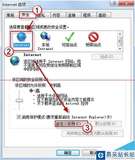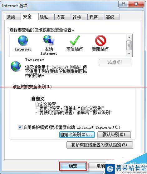 3、切換至“安全”選項卡,選中“Internet”區(qū)域,然后單擊“自定義級別”按鈕