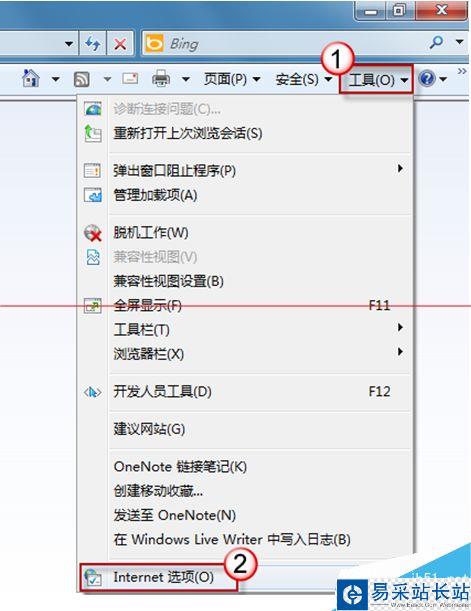 2、打開 Internet Explorer 8,在右上角單擊“工具->Internet 選項