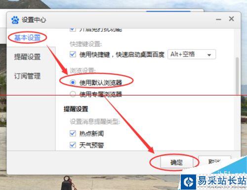 3、在【設置中心】界面下,點擊選擇【基本設置】--勾選【使用默認瀏覽器】--【確定】選項完成設置 。(如圖所示)