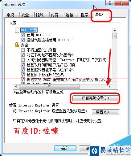 3、找到internet選項對話框,找到【高級】 選擇【還原高級設置】如圖