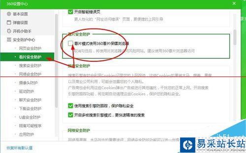 5、點擊安全防護模式以后再右面會彈出一個新的窗口,有個選項,看片模式使用360看片保鏢瀏覽器