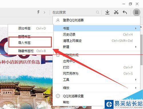 3.此時關于書簽的所有設置都在這里了,我們可以添加、整理、導入以及隱藏書簽。而我們要做的就是需要選擇導入書簽。