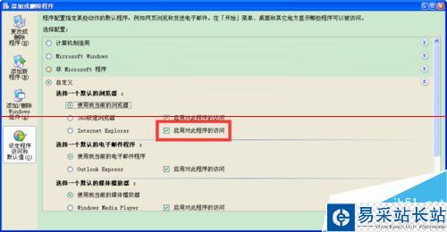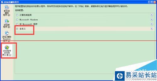 3、【添加或刪除程序】的窗口,選擇“設(shè)定程序訪問和默認(rèn)值”,點擊“自定義”。