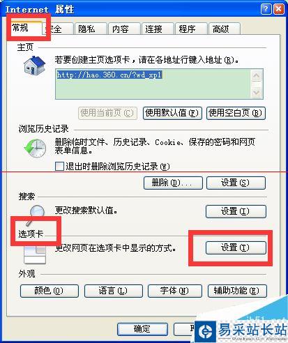 6、【internet屬性】的窗口,在“常規(guī)”里選擇“選項卡的”設(shè)置“。