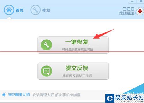 6、然后如果在360瀏覽器上打開百度也出現亂碼,那我們只需點擊瀏覽器下方的“醫生”功能選項,然后點擊一鍵修復即可。