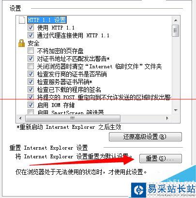 5、進(jìn)入高級界面,點(diǎn)擊【重置Internet explore設(shè)置】后方的【重置】選項(xiàng)