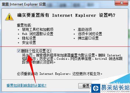 6、在彈出的重置對話框里勾選【刪除個性化設(shè)置】,然后點(diǎn)擊【重置】