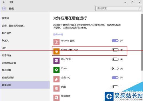 3、打開“背景應用”設置。在右邊欄找到“Microsoft Edge”,將開關設置為“關”。如圖所示。