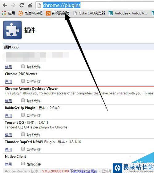 2、解決方法也很簡單,打開瀏覽器,我們在瀏覽器的地址欄,也就是輸入網址的地方輸入“about:plugins”或者“chrome://plugins/”,不加引號,然后回車。