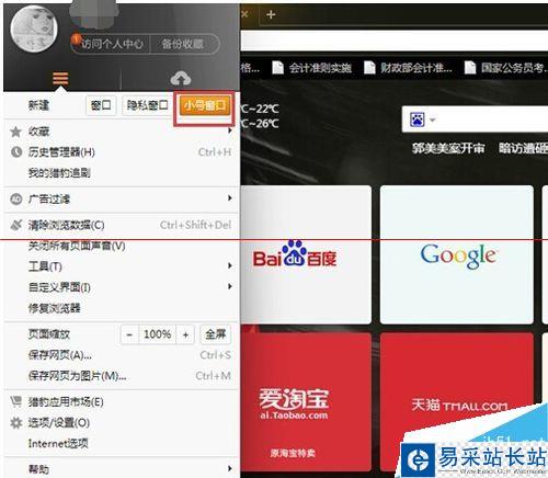 3、找到小號窗口。點擊左上角的圖標,會出現一個下拉菜單,在這個下拉菜單中,可以在上面很容易發現”小號窗口“字樣。