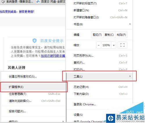 3、在“自定義及控制Google Chrome”里面打開“工具”下的“擴展程序”。