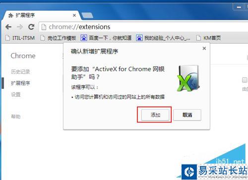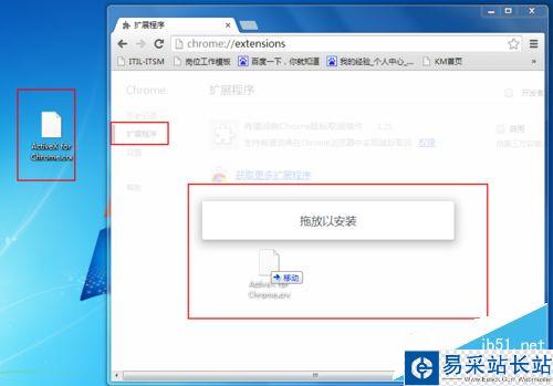 4、選擇“擴展程序”,把桌面的“ActiveX for Chrome 網銀助手”拖進瀏覽器里面,這樣就安裝完“ActiveX for Chrome 網銀助手”了。