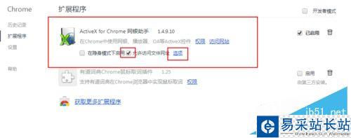 5、安裝完后在“ActiveX for Chrome 網銀助手”下面的“允許訪問文件網址”前面打勾,然后打開“選項”。