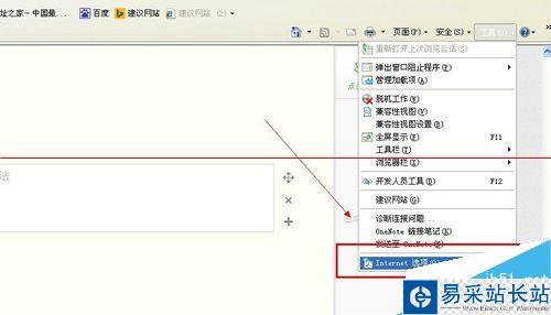 2、在“工具”下拉菜單中找到“internet選項”,在菜單的最下端,如下圖所示。
